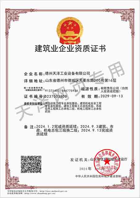 德州天澤工業(yè)設(shè)備有限公司成立于2003年(前身為德州天元集團(tuán)天明工業(yè)設(shè)備安裝公司),經(jīng)過20多年的發(fā)展,現(xiàn)成長為擁有職工600余人,各類專業(yè)技術(shù)人員近300余人,年生產(chǎn)能力兩億元以上,以建筑機(jī)電安裝工程、消防設(shè)施安裝工程施工為主,集建筑工程施工、市政工程施工、建筑智能化工程施工、園林綠化工程施工、工程管理服務(wù)、物業(yè)管理、電氣機(jī)械設(shè)備銷售等多元化經(jīng)營于一體的綜合型企業(yè)。2005年,企業(yè)按照國際標(biāo)準(zhǔn)建立的質(zhì)量管理體系,通過了ISO質(zhì)量管理體系認(rèn)證、環(huán)境管理體系認(rèn)證、職業(yè)健康安全管理體系認(rèn)證。施工工程遍布山東、河北、四川、江蘇等地,最具代表性的工程有:山東省德州市百腦匯資訊廣場機(jī)電安裝工程、德州經(jīng)濟(jì)開發(fā)區(qū)天元大廈機(jī)電安裝工程、陵城區(qū)人民醫(yī)院機(jī)電安裝工程、德州金魯班大廈機(jī)電安裝工程、河北故城金辰小區(qū)機(jī)電安裝工程、北川地震災(zāi)后援建工程等。多年來,公司始終堅(jiān)持“以人為本,建精品工程,創(chuàng)行業(yè)品牌”的經(jīng)營理念,先后榮獲省(市)級泰山杯、天府杯、魯安杯等獎項(xiàng),申報各種功法、多項(xiàng)專利。